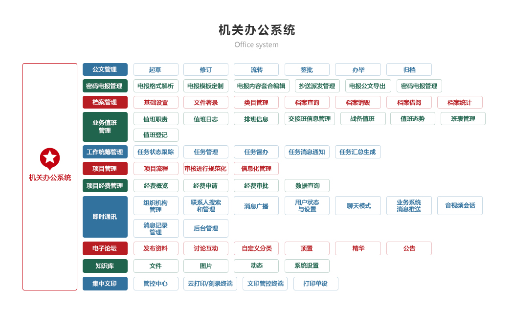 包含通知公告、部隊(duì)要訊、公文辦理、值班交班、工作計(jì)劃、文化共享、即使通訊、文件打印功能模塊。