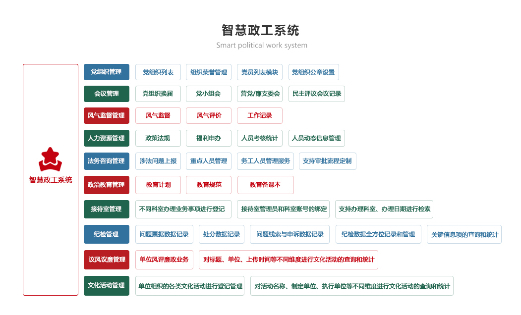 政治教育系統(tǒng)輔助政治機(jī)關(guān)做好人員思想常掌握、政治教育全覆蓋、人才培養(yǎng)見成效和黨建工作更務(wù)實(shí),特別是依托新媒體,在手機(jī)上開展移動(dòng)政治工作,激發(fā)官兵參與互動(dòng),主要包括人力資源、 組織建設(shè)、政治教育和保衛(wèi)工作功能。